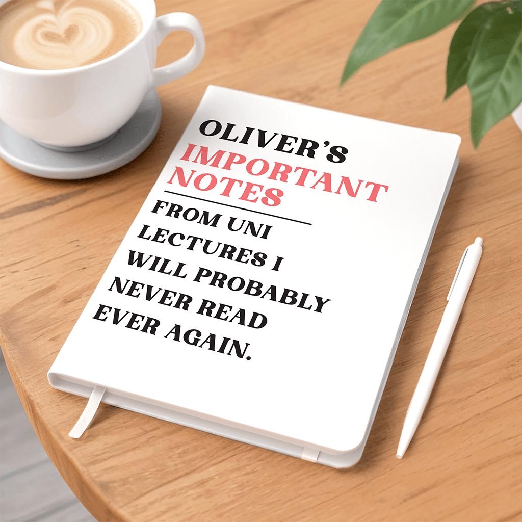 Funny Personalised White Notebook – ‘Important Notes’ Printed Gift for University Students