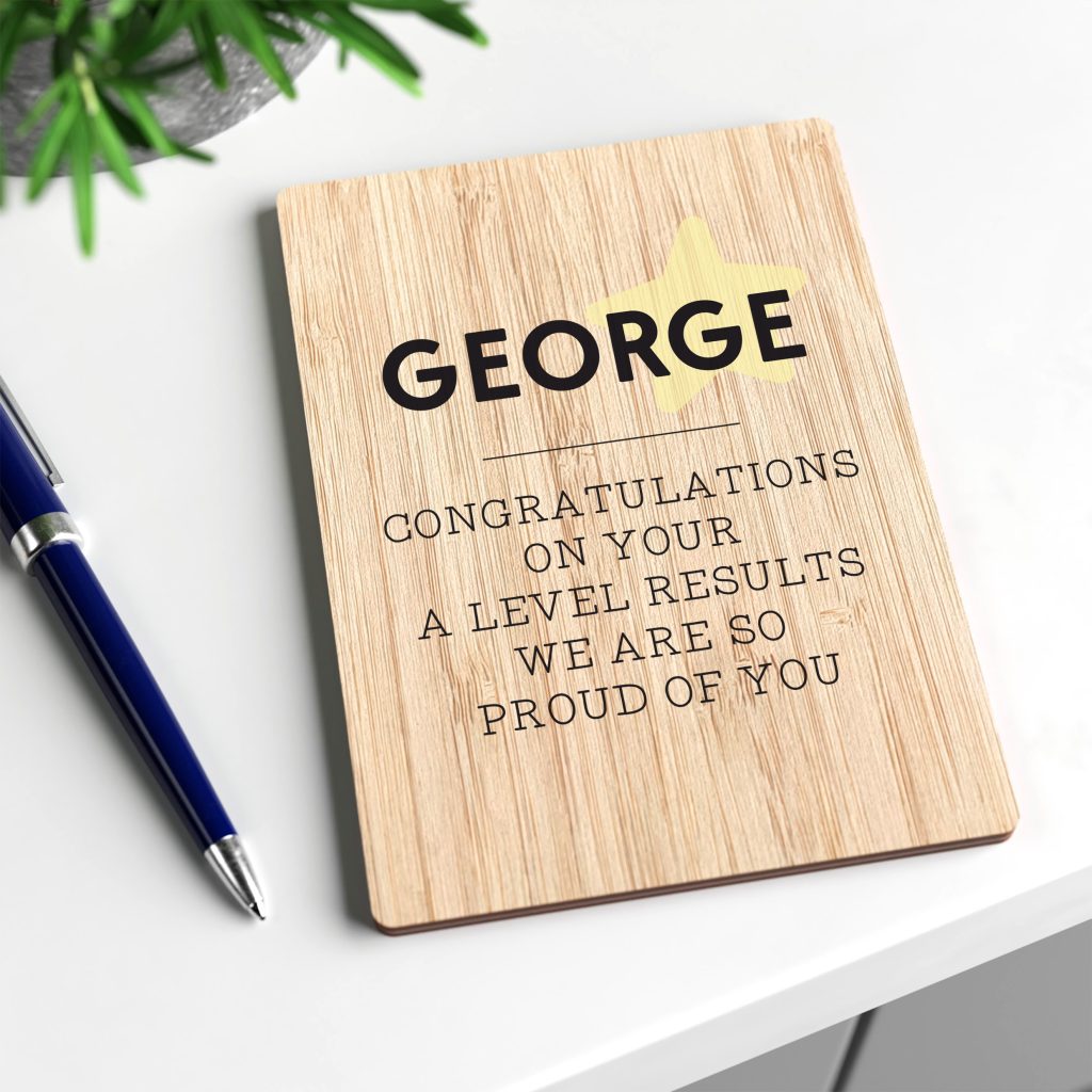 Say well done on their amazing A Level results with this personalised wooden greetings card which can be personalised with any names – a lovely congratulations gift for him or her.